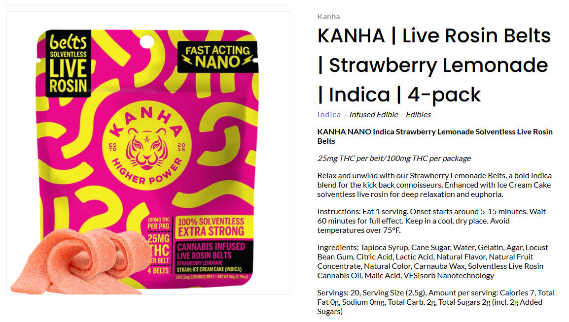 Live Rosin Belts Strawberry Lemonade IndicaEdibles — Kanha Gummies — $20 each